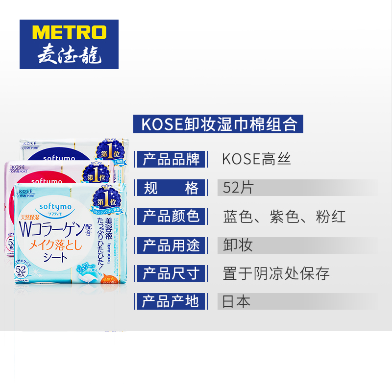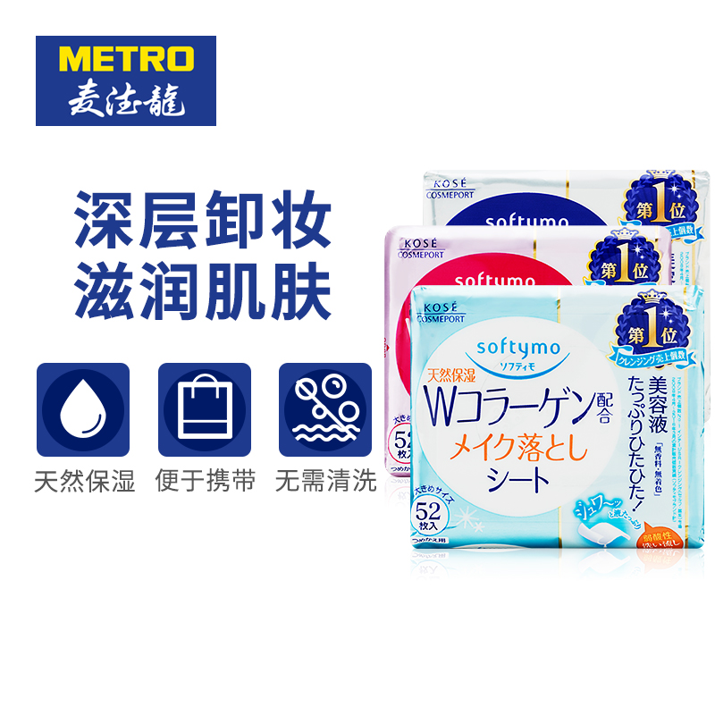 麦德龙官方海外旗舰店麦德龙日本进口KOSE高丝卸妆湿巾3色组合52片x3包 干净便捷无刺激薏仁胶原蛋白、抽取式设计易携带